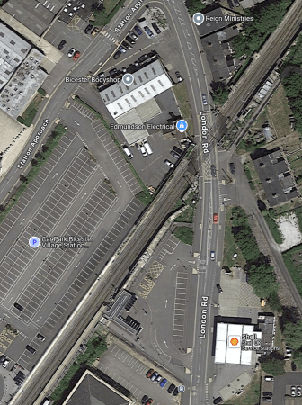 - To take the pictures of the level crossing, I crossed the footbridge to the North-West side of the station and walked through the car park to the station entrance on Station Approach. I then walked past the Bicester Bodyshop and Edmundson Electrical to the level crossing.