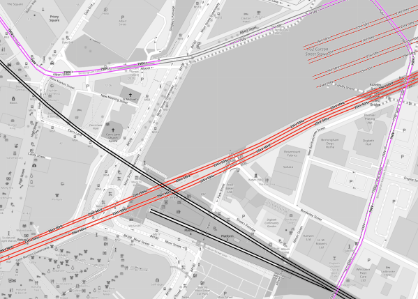 - Three red buffer stops can be picked out.