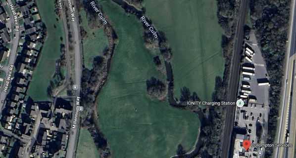 This Google Map shows, the railway and the M5 passing Collumpton.