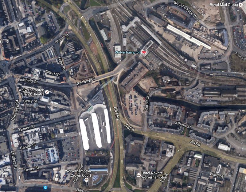 The big roundabout south of the bridges and the three limbs of the bus station is where the Metro enters Wolverhampton City Centre to terminate at Wolverhampton tram stop. Could not a branch turn north to serve the bus and train stations, Wolverhampton University and Molineux? In an ideal world, it would continue past the football ground to perhaps a Park and Ride site on the other side of the city. Or it could even go further round the Inner Ring Road and loop back into the City Centre to the existing terminus.